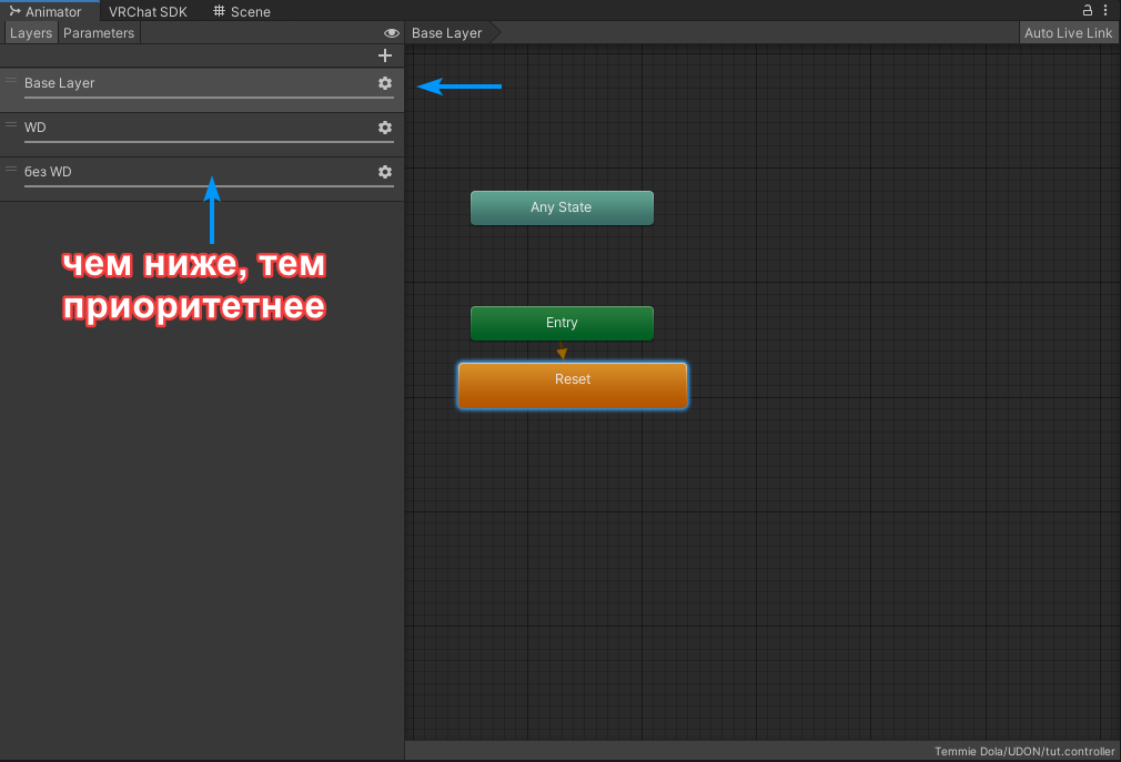 На других слоях у меня только пустая анимация которая переходит с условием в анимацию включения. Так как все анимации под Reset в приоритете, всё будет работать. Например в 1 слое с "Reset" сказано, что шляпа выключена, а на 2 слое у меня есть анимация, которая эту шляпу включает.