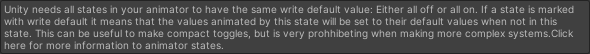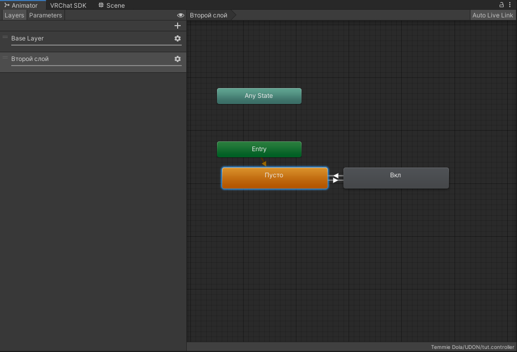 Первоначальный оранжевый стейт во втором слое пустой, поэтому ничто ничего не меняет, но стоит мне перейти в анимацию включения, как шляпа включится, так как второй слой приоритетнее первого и в нем сказано эту шляпу включить. Когда я вернусь в пустой стейт, то ничего не будет говорить шляпе включиться и ее значение примет значение из "reset", а значит выключится. Этот способ кажется довольно замороченным, но таким образом вместо кучи анимаций выключения вам нужно сделать всего одну и изменять в будущем только её. В своём гайде кстати я пользовался этим способом