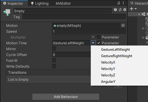 Если у тебя в анимации 60 кадров, а параметр указанный в motion time равен 0.5, то у тебя анимация будет стоять на 30ом кадре, и всё